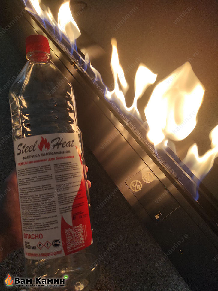 Автоматический биокамин Airtone Andalle 1200 работает на биотопливе – биоэтаноле, не требуя подключения к дымоходу. При этом, как это видно на фотографиях, покупатель также решил купить биотопливо SteelHeat. Биотопливо SteelHeat на 95% состоит из биоэтанола и на 5% из дополнительных добавок для красоты и яркости огня.